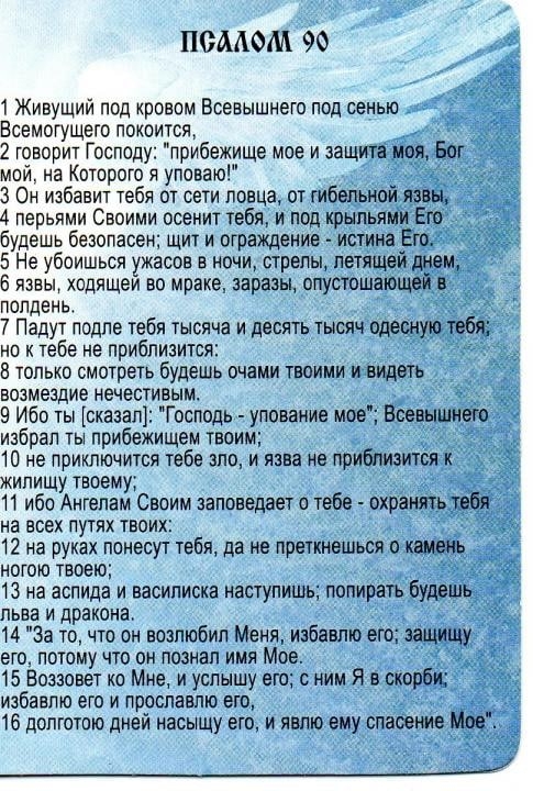 На этой странице вы познакомитесь с молитвой, которая призвана помочь вам и вашим близким в любой ситуации. Это молитва – Псалом 90. Предложу вам две подсказки, как более продуктивно применять ее в повседневной жизни. Вникая в этот Псалом Божественного обетования даного верующим в Него людям, проникнитесь всей глубиной Его любви, непробиваемой защите для нас от всех напастей. Вы поймете, как Бог относится к тем кто дружен с Ним, и к тем, кто отрицает, а тем более гневит Его. Это Слово Бога к нам, всем. Впрочем как и вся Библия.
